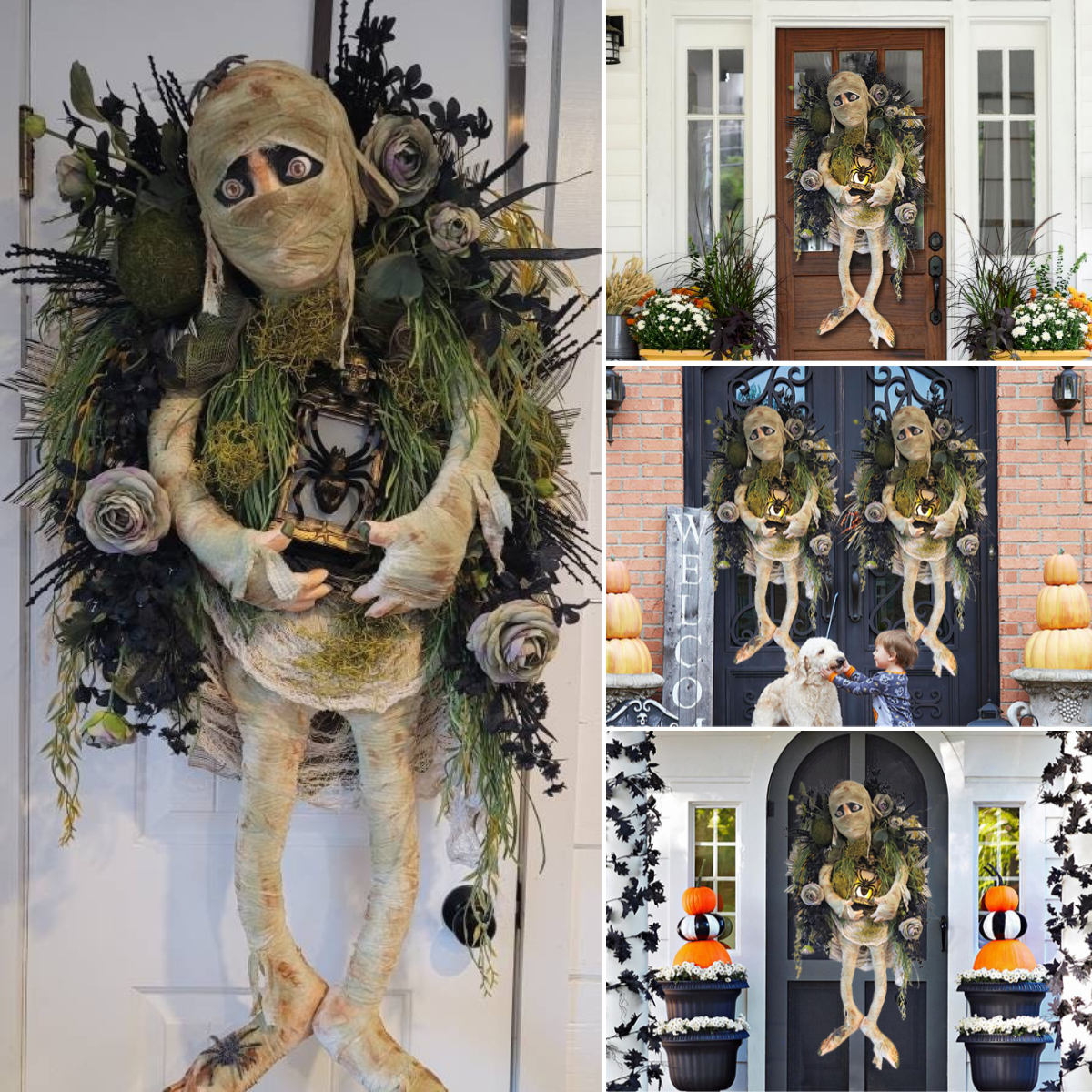 This large Mummy appears to be walking out of the spooky 👻 woods on Halloween night . He is surrounded by spooky curly faux wood sprays, black florals and curly moss stems.